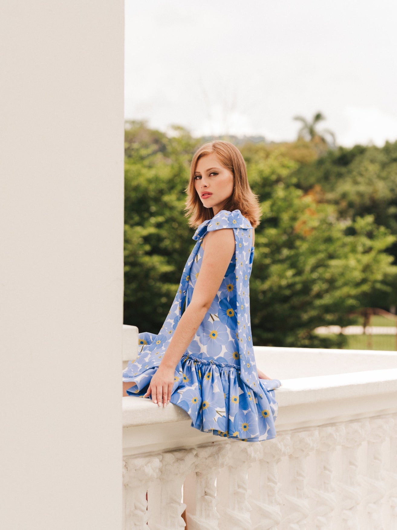 One-shoulder mini dress in an A-line silhouette, accented with a bow and the signature NoMeOlvides ruffle. A graceful choice for sunlit days and warm evenings.
