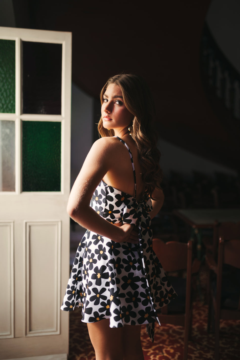 This top features thin straps and a V-neckline. It ties at the back with an adjustable bow, ensuring a perfectly customizable and graceful fit.