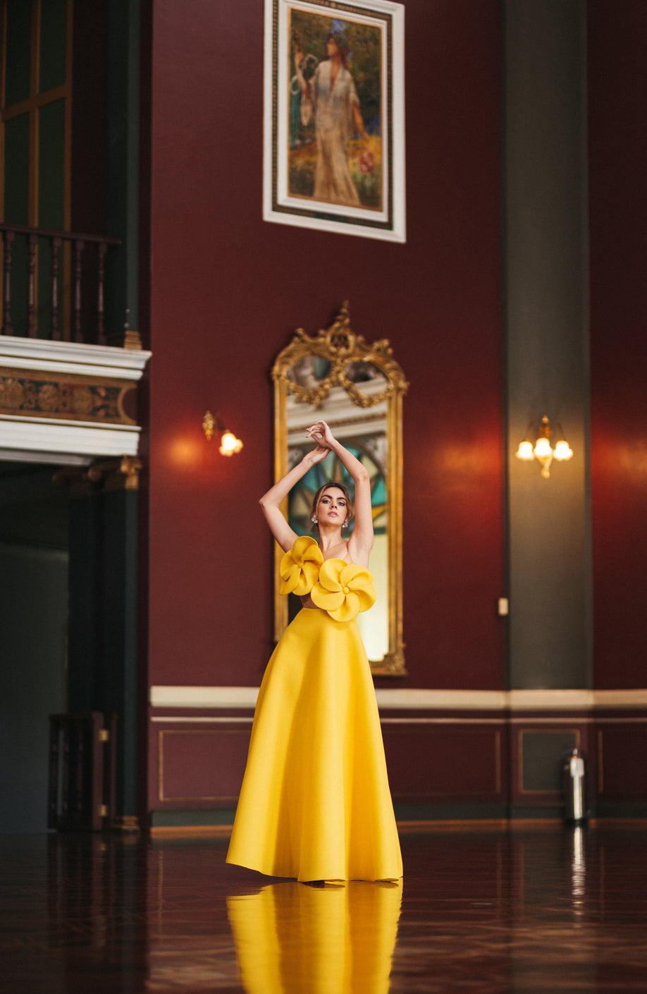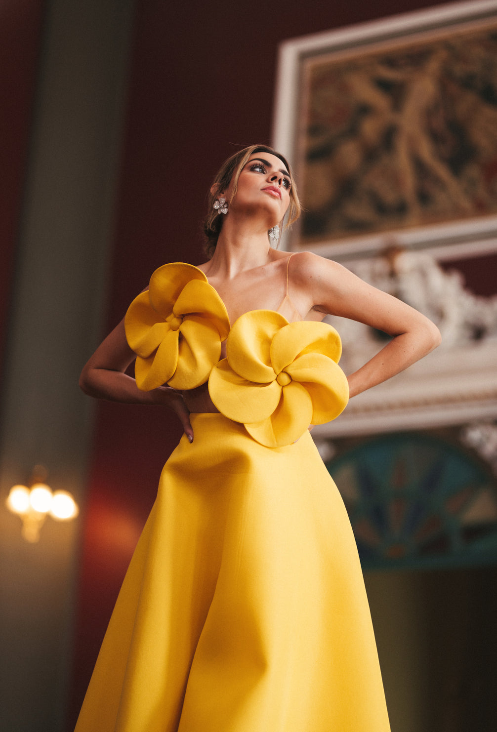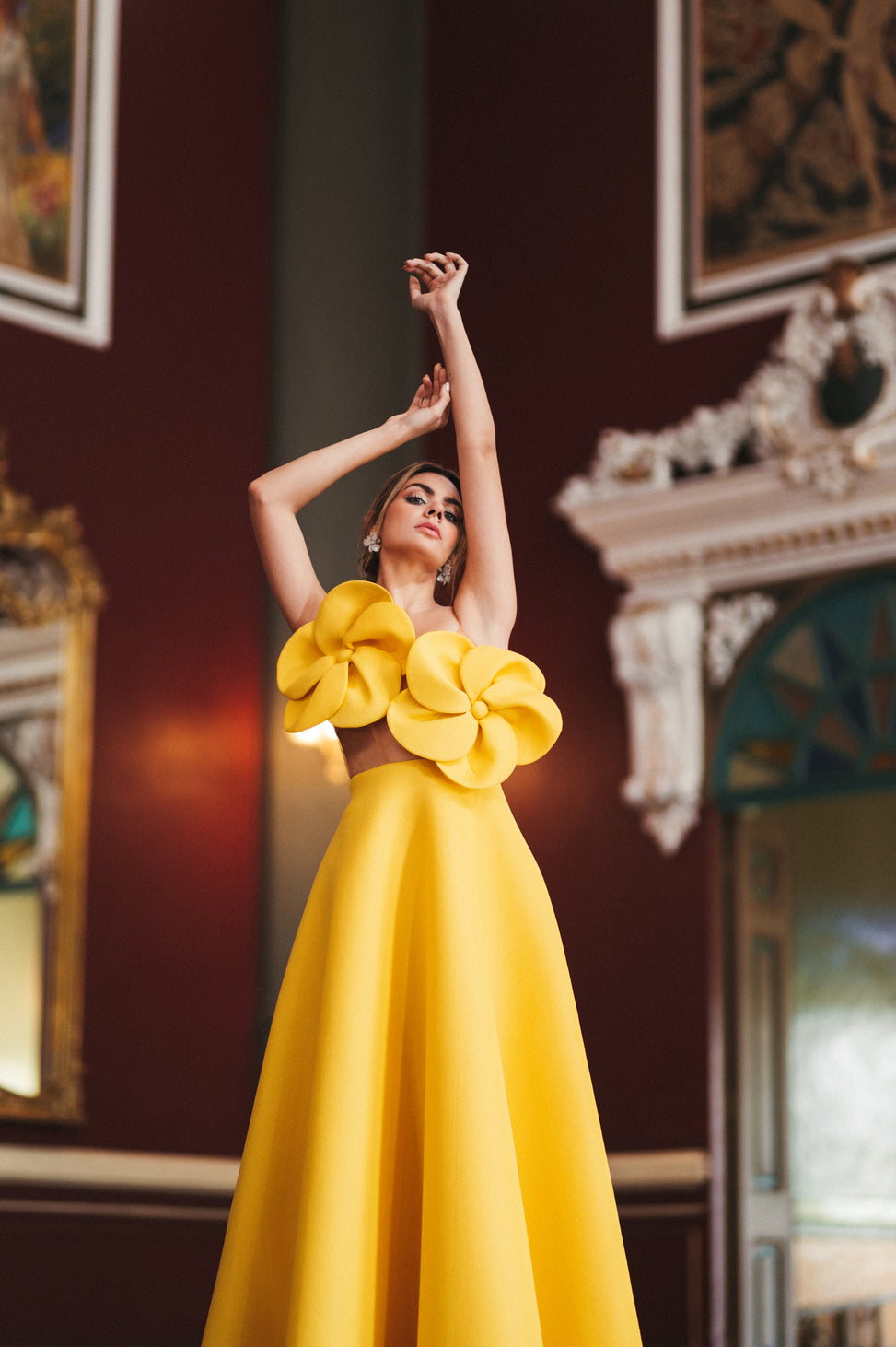 This stunning dress is made with a mesh top adorned with handmade flowers that add a touch of delicate artistry. Its sophisticated backless design beautifully complements the fitted bodice, which gracefully flows into a flared skirt for an undeniably elegant and striking silhouette.
