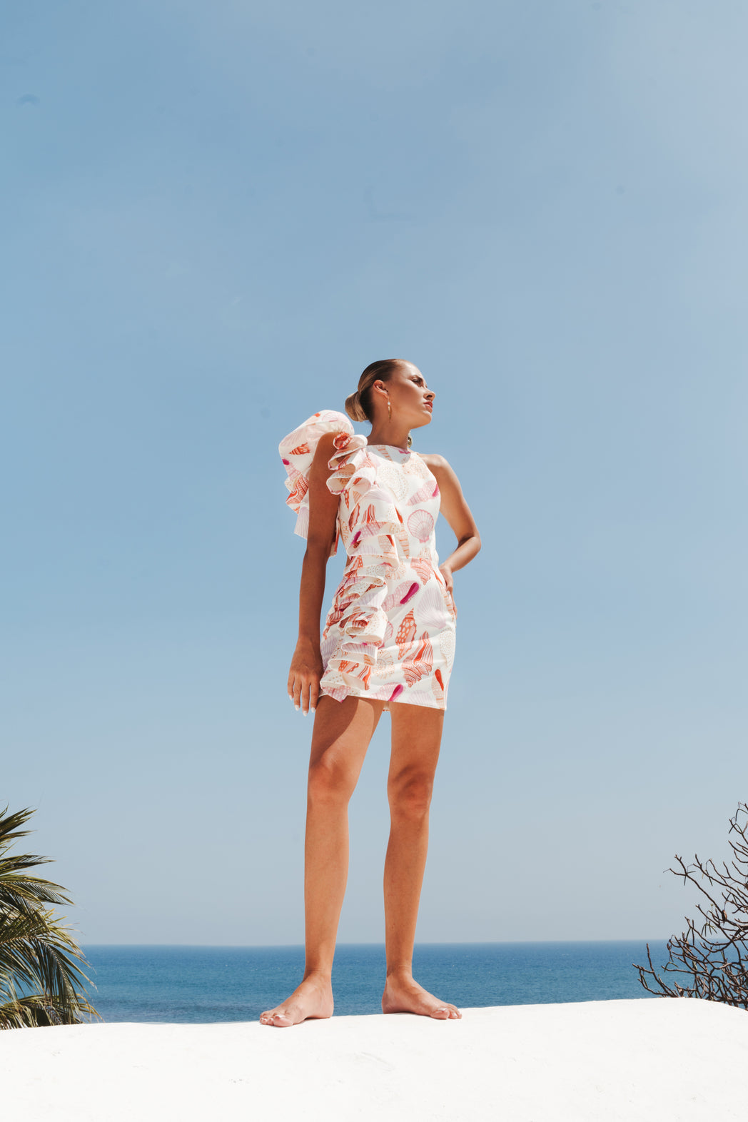 A sophisticated dress combining a halter neck with a fitted mini skirt. A captivating ruffle, inspired by the delicate curves of a shell, creates a highlight on the right side of the piece.