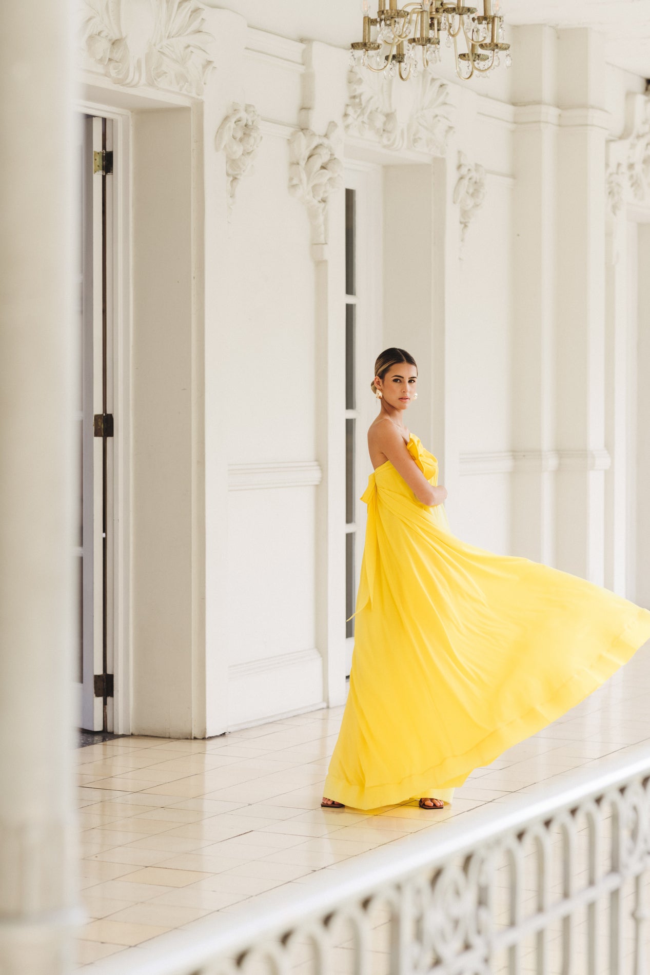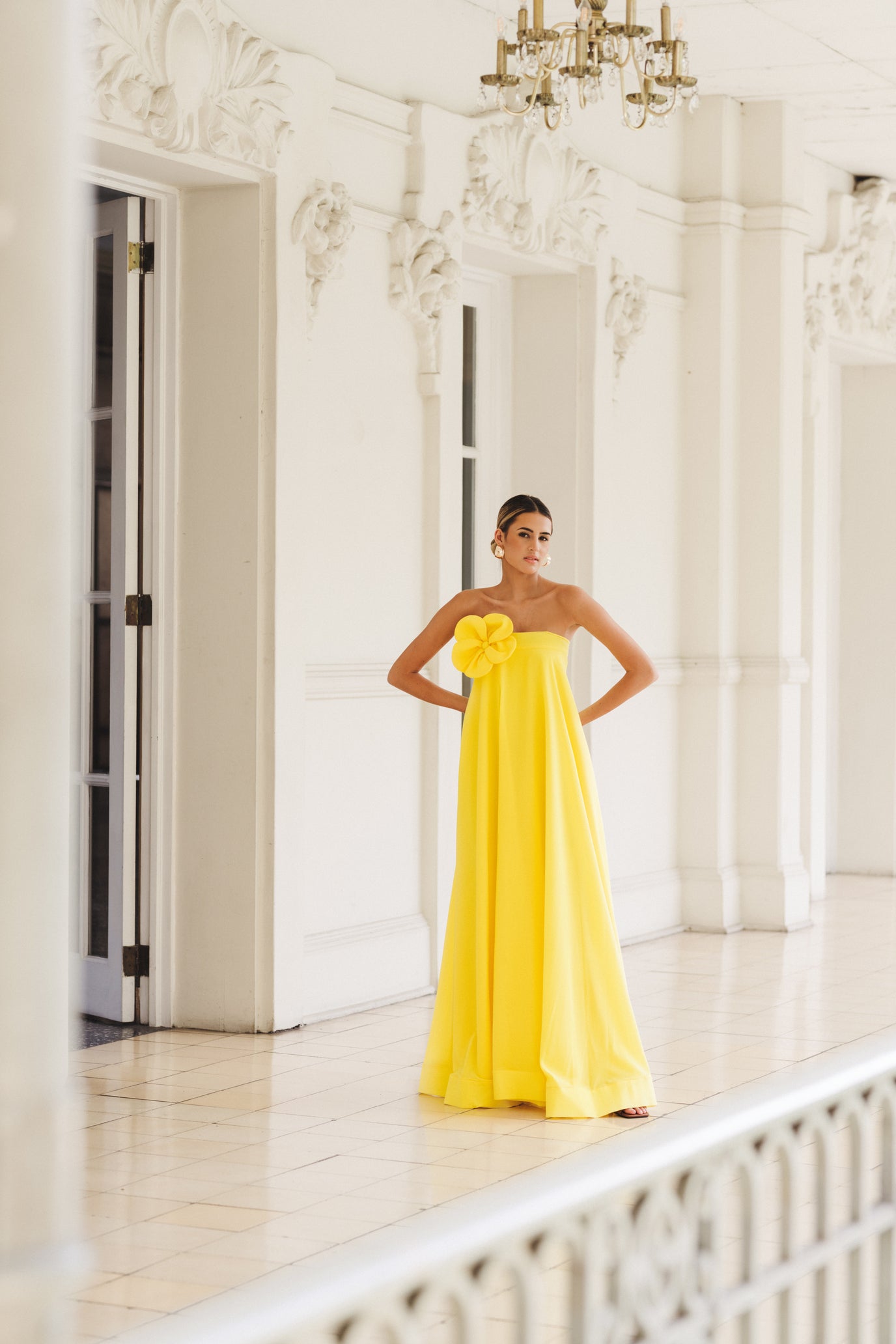 Flowy maxi dress featuring a handmade flower detail on the side, adding a unique and romantic touch.