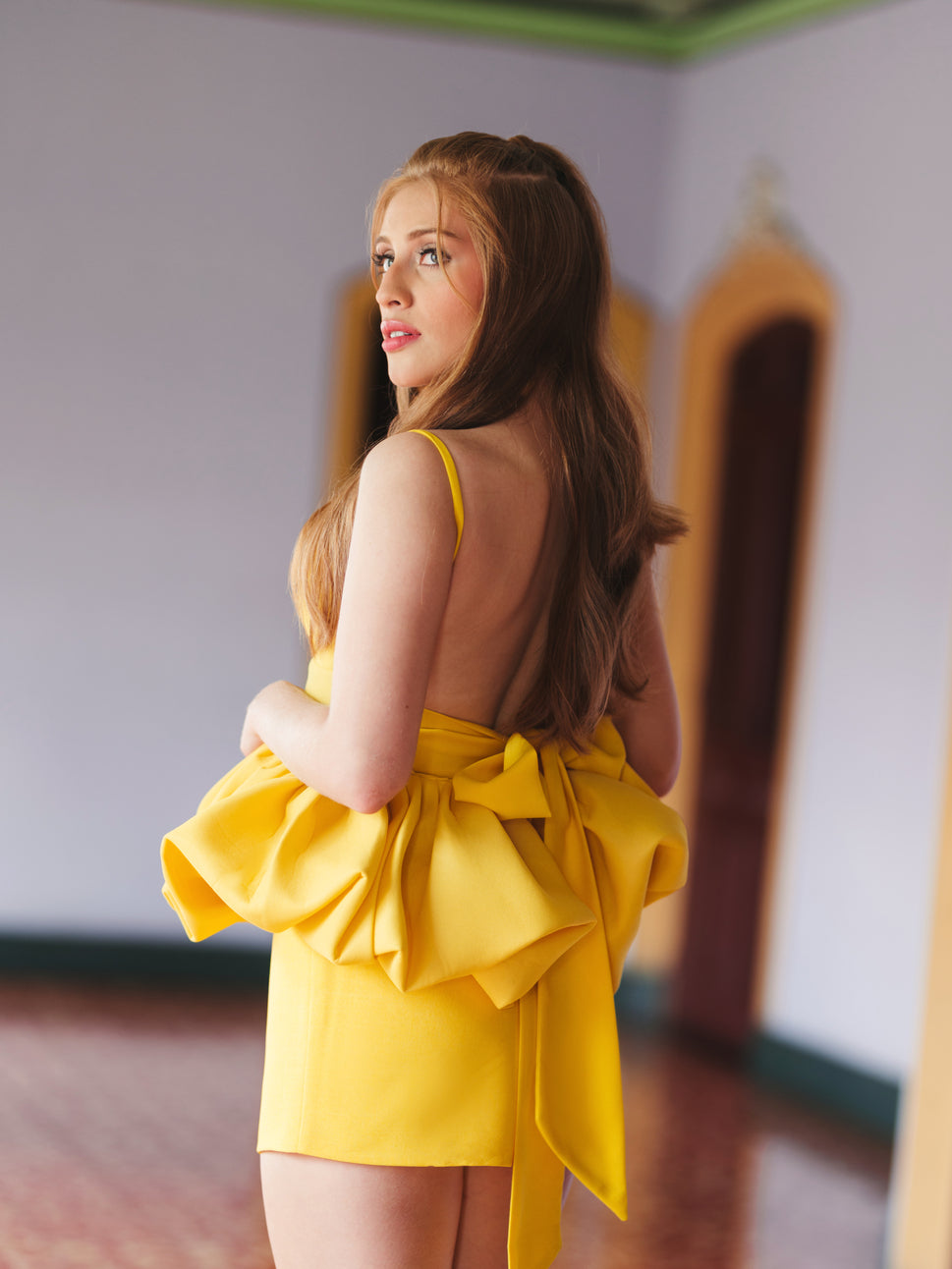 A chic top with an elegant deep neckline and a voluminous statement peplum bubble hem. Its adjustable tie-back offers a customizable fit, ensuring a beautifully flattering and feminine silhouette.